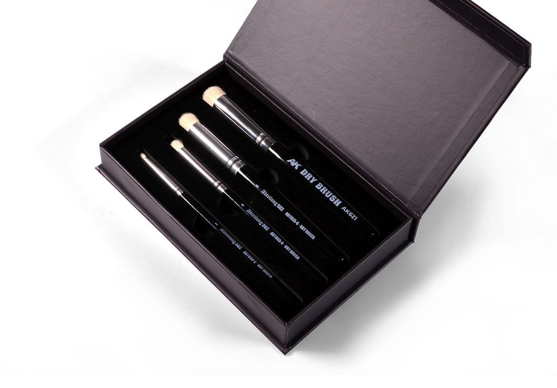 Zestaw zawiera pędzle z serii Dry Brush, wykonane z wysokiej jakości i wytrzymałego włosia syntetycznego, z zaokrągloną końcówką zbliżoną do tych używanych w pędzlach do makijażu.