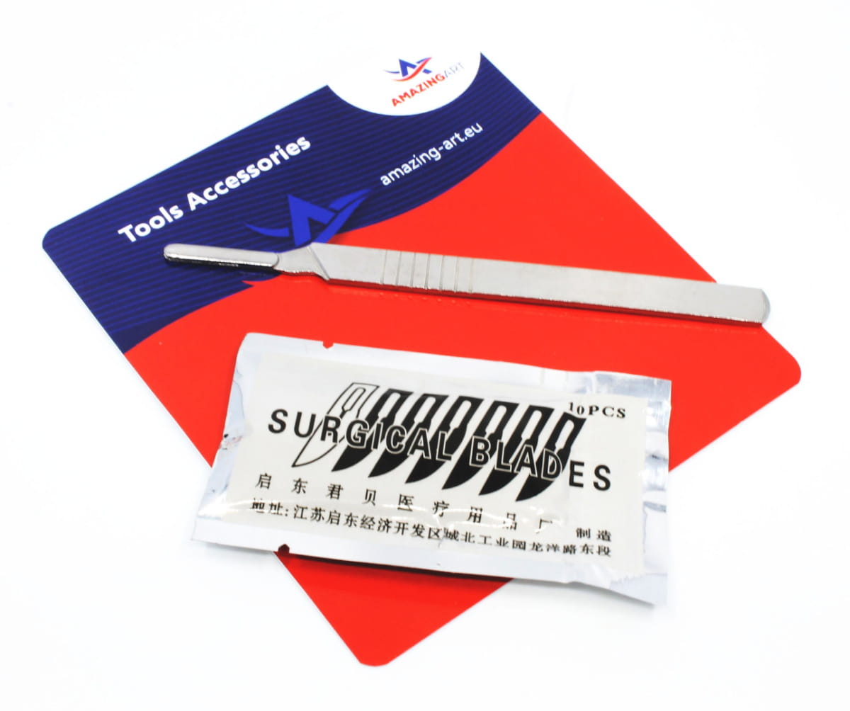AMAZING ART - NÓŻ SKALPEL CHIRURGICZNY + 10 OSTRZY to niezastąpione narzędzie w każdym warsztacie modelarskim i rzemieślniczym, oferujące precyzyjne cięcie, komfort użytkowania i wygodę w codziennym stosowaniu.
