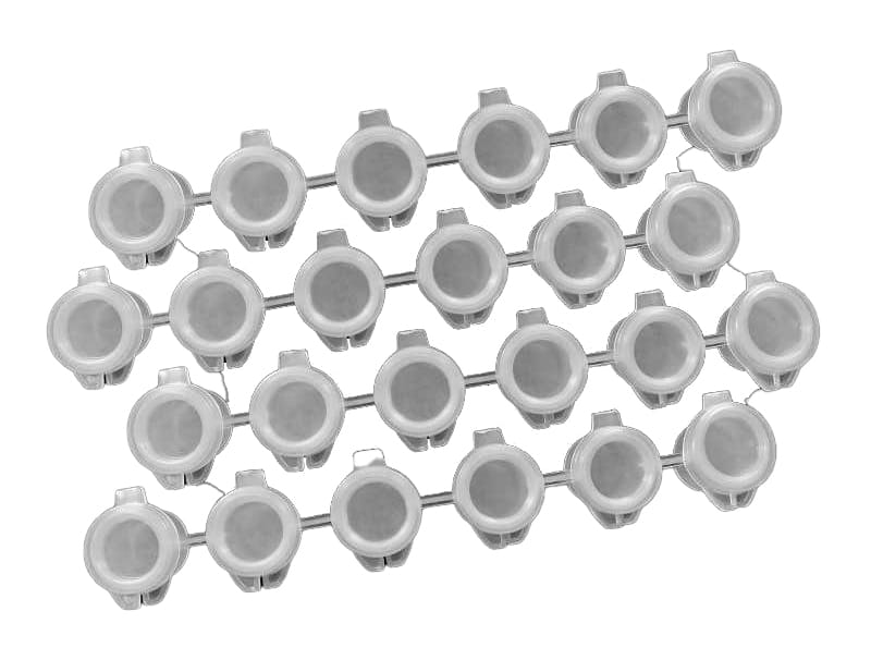 Zestaw 24 małych plastikowych pojemników do mieszania farb i tuszów. Prezentowany w 4 paskach po 6 doniczek każdy. Każdy garnek ma dołączoną pokrywkę, którą można zamknąć podczas potrząsania mieszanką lub w celu bezpiecznego przechowywania mieszanki.