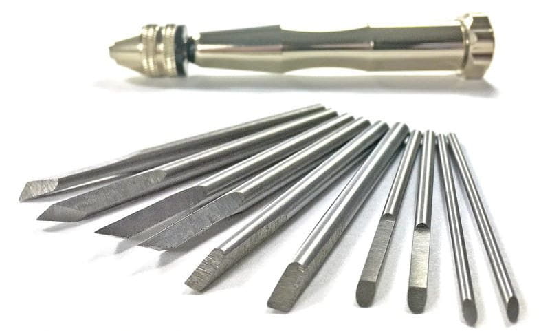 Zestaw narzędzi dłutowych zawierający 10 precyzyjnych końcówek wykonanych ze stali szybkotnącej wolframowej do rzeźbienia w drewnie, miękkim metalu, plastiku i żywicy. Solidna aluminiowa rączka pozwoli na łatwą wymianę końcówek w dogodnym momencie.