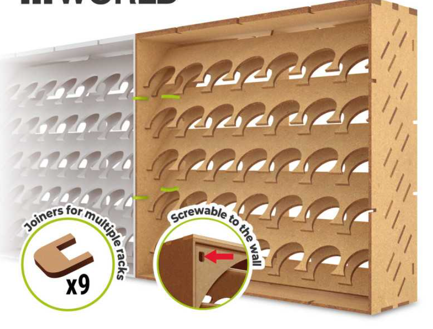 Umożliwia przechowywanie butelek do góry nogami. Zawiera łączniki do łączenia wielu stojaków. Można przyszyć do ściany.