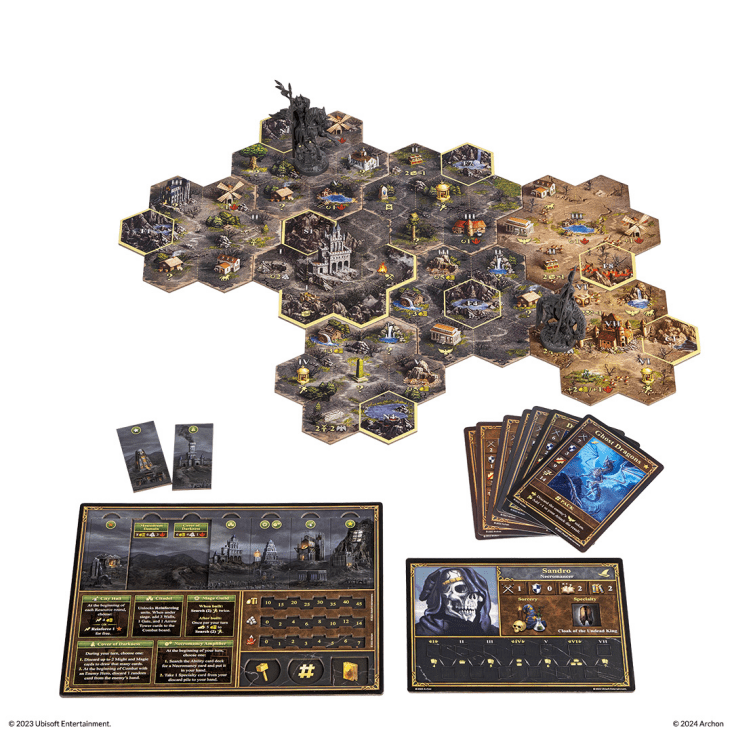 Heroes of Might & Magic III®: The Board Game is an adventure-driven strategy game for 1-3 players set in a cult fantasy universe. The game includes competitive, cooperative, and solo scenarios to battle and explore your way through. The adventure maps are represented by tiles, with each tile being divided into seven hexagonal fields.