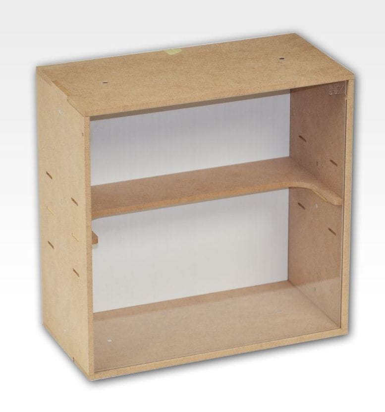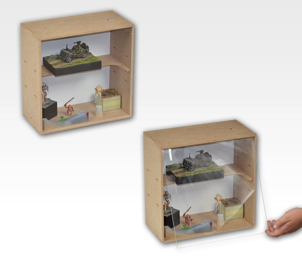 Moduł Gablota Duża WIP z akrylową szybą do zabezpieczenia modeli przed kurzem i uszkodzeniami, regulowana wysokość półki.