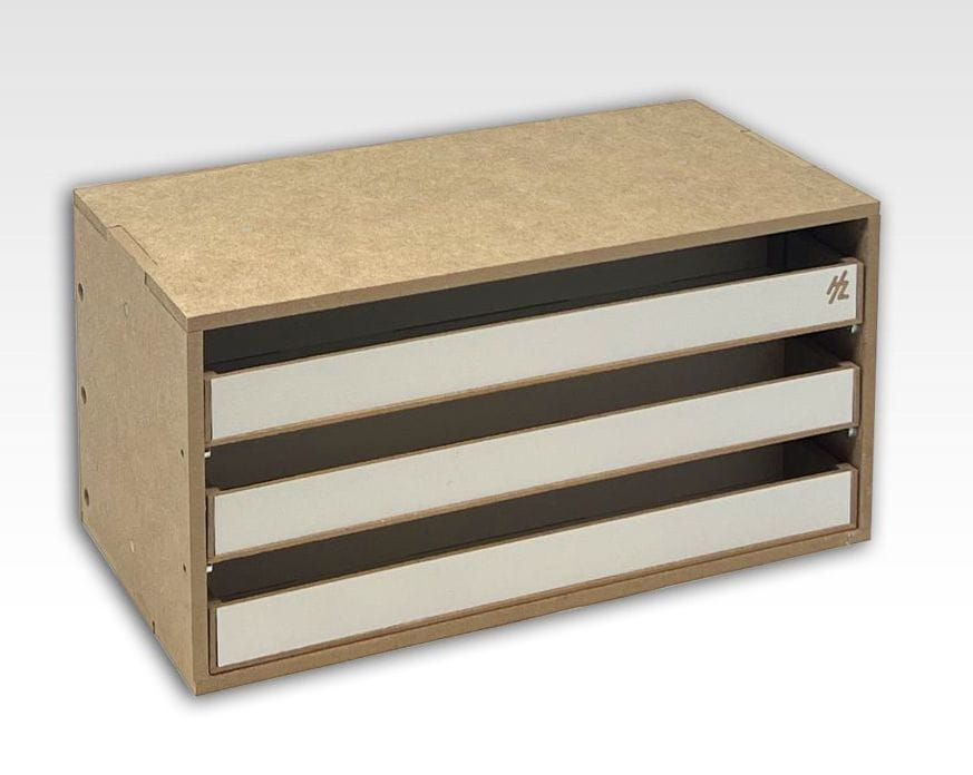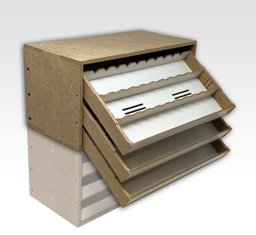 Uniwersalny moduł z trzema uchylnymi szufladami przystosowanymi do przechowywania większości pojemników z farbami modelarskimi (o średnicy do 43mm), a także z klejami oraz panel liner'ami firmy Tamiya. Moduł może pomieścić do 63 tub z farbami Vallejo/Army Painter 17 ml lub 63 słoiczki Tamiya Akryl 10 ml!