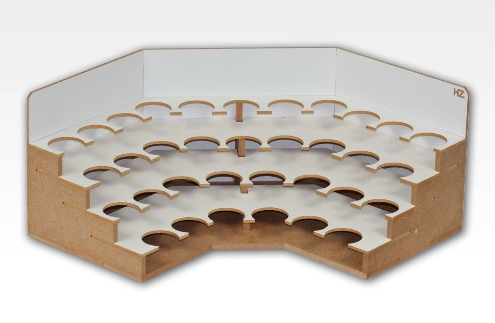 Moduł Narożny na Farby 36mm posiada trzydzieści cztery uchwyty na farby i inne butelki do średnicy 36mm, zmienia kąt rozstawienia modułów o 90 stopni.