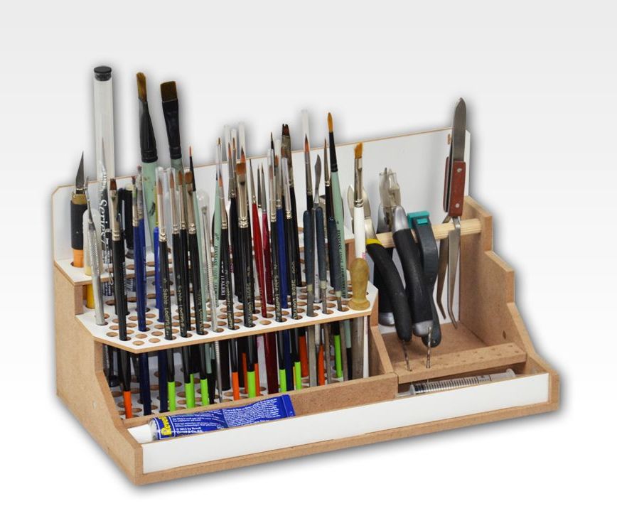 Moduł na Pędzle i Narzędzia posiada kilkadziesiąt otworów różnej średnicy na narzędzia, wbudowany dodatkowy drążek na szczypce itp.