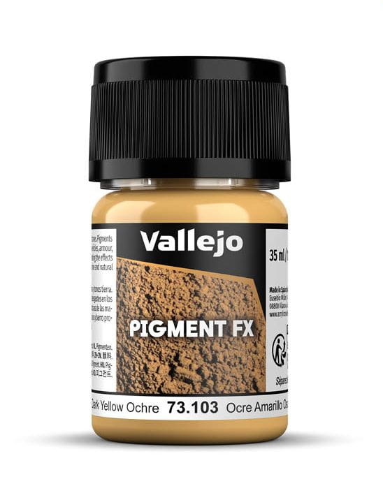 Pigmenty Vallejo, wybór naturalnych pigmentów ziemnych i syntetycznych, zostały wybrane ze względu na ich trwałość, doskonałą odporność na światło oraz bardzo drobne mielenie ich cząstek, co ułatwia mieszanie i ich aplikację na modelach i dioramach. Asortyment pigmentów obejmuje serię kolorów wybranych do przedstawiania zużycia i erozji spowodowanej warunkami intensywnego użytkowania i ekspozycji pojazdów i budynków, aby odtworzyć kurz osadzony na gąsienicach czołgów, rdzę na pancerzu i szerokie zakres skutków spowodowanych warunkami klimatycznymi i geograficznymi rozmieszczenia. Pigmenty można nakładać w postaci suchej, bezpośrednio pędzlem na model, ponieważ mają doskonałą przyczepność; można je również utrwalić za pomocą rozcieńczalnika, gdy są używane do przedstawiania suchego błota lub nagromadzonego pyłu.